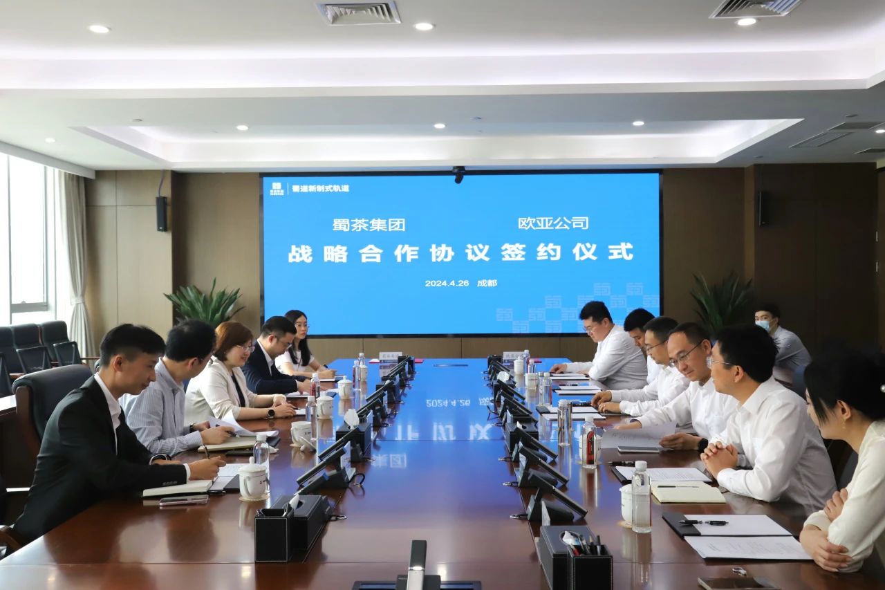 4月26日,蜀道新制式軌道集團(tuán)所屬歐亞公司與四川省農(nóng)產(chǎn)品經(jīng)營(yíng)集團(tuán)所屬蜀茶集團(tuán)在成都正式簽訂戰(zhàn)略合作協(xié)議。蜀道新制式軌道集團(tuán)黨委委員、財(cái)務(wù)總監(jiān),歐亞公司黨支部書記、執(zhí)行董事、總經(jīng)理尚宗飛,蜀道新制式軌道集團(tuán)副總經(jīng)理劉剛,省農(nóng)經(jīng)集團(tuán)董事長(zhǎng)、蜀茶集團(tuán)董事長(zhǎng)何昕,蜀茶集團(tuán)總裁陳思遠(yuǎn)出席簽約儀式。