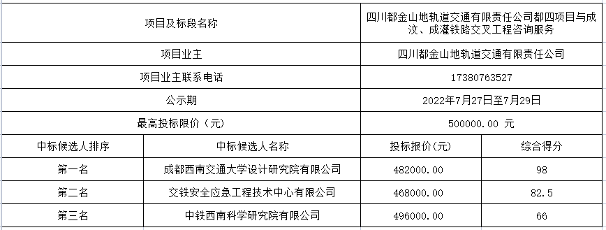 四川都金山地軌道交通有限責任公司都四項目與成汶、成灌鐵路交叉工程咨詢服務評審結果公示